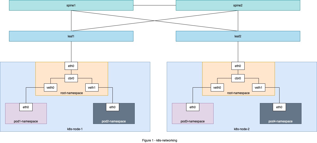 The default network namespace is referred to as the root namespace. This namespace owns the network interfaces that are bound to the machine. When pods are created a dedicated network namespace is created for each pod. Each pod’s ethernet interface is logically wired up to the root namespace via veth. The veth devices are virtual Ethernet devices. They can act as tunnels between network namespaces to create a bridge to a physical network device in another namespace, but can also be used as standalone network devices.